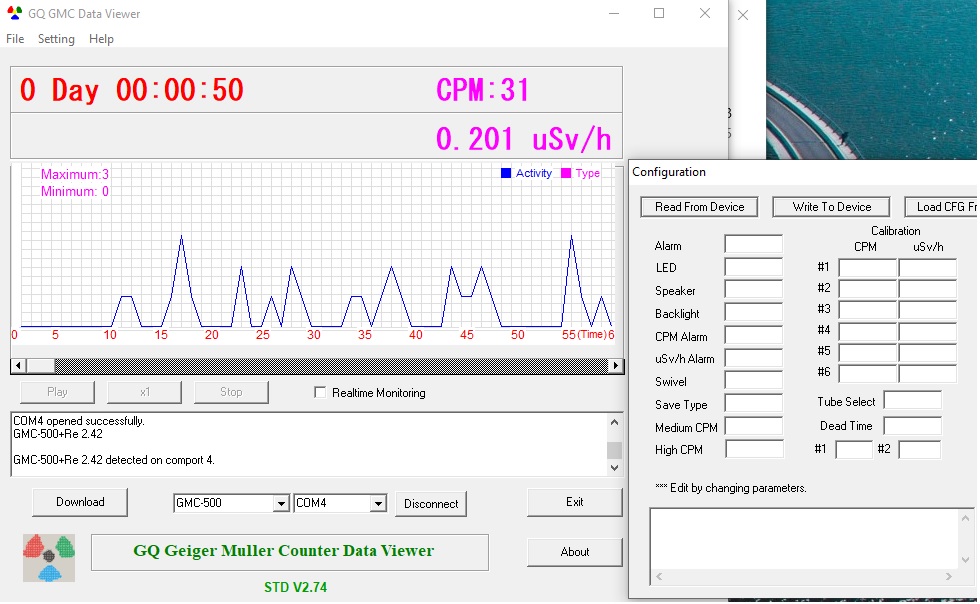 but after Configuration / "Read From Device" it shows: corrupted data under calibration, and CPM Alarm: -1 (should be 100) i did NO "Write To Device" !!!