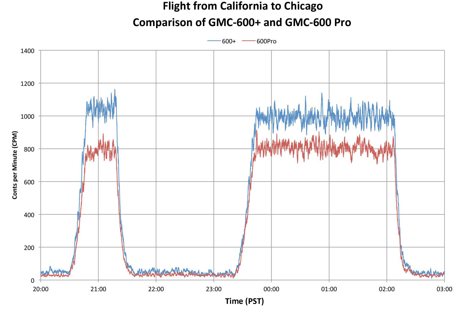Soon after, I took the GMC-600+ and the GMC-600 Pro on a commercial aircraft flight from California to Chicago and back. I placed both detectors side-by-side in my nylon-sided carry-on bag which I placed in the overhead storage. Both units had the LND7317 windows facing up and had nothing except one thickness of nylon (the top of the bag) over them. The one-hour running average (OHRA) readings from the GMC-600 Pro, both on the ground and at altitude and on both flights, were consistently only 70% to 74% of the OHRA readings from the GMC-600+.