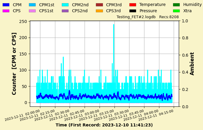 Background is reporting about 20 cpm or about 0.14 microSv/h, ignoring periods of dramatic spikes. I don't have another device to confirm this is correct. |