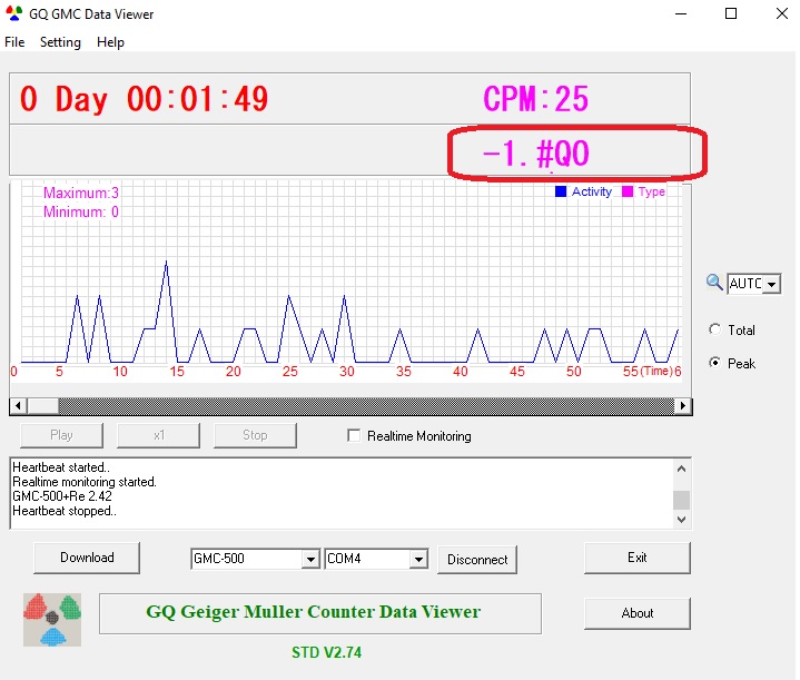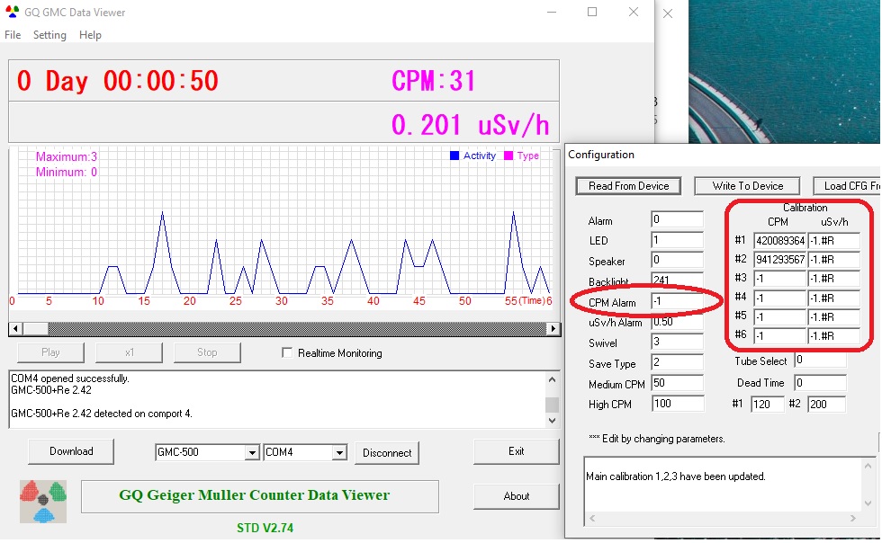 but after Configuration / "Read From Device" it shows: corrupted data under calibration, and CPM Alarm: -1 (should be 100) i did NO "Write To Device" !!!