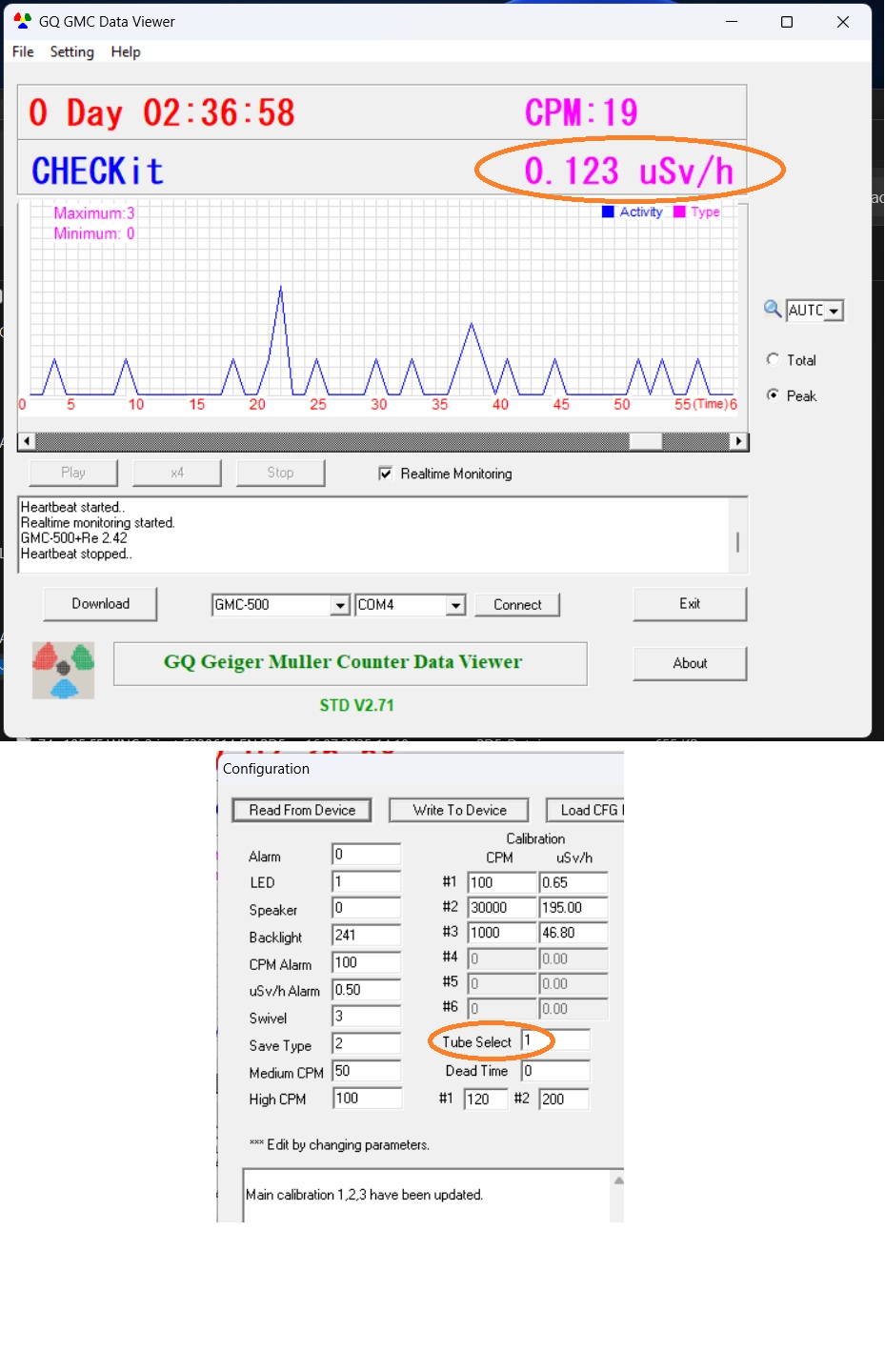 DataViewer is a realy nice part of software! at moment i start to work with higher activity-probes, for this i switch the counter-hardware to use "Tube2"-selection only. . but DataViewer mainscreen in realtime monitoring activ still shows the uSv/hour-calculation based on Tube1-calibration :( thats wrong - isn't it? . Is it possible to add a field on mainscreen where i can manually fill in the calibration value, on which the realtime uSv/hour-calculation should be based on? if that field is empty, it can use the default Tube1 value, this will match the most common use of Tube1, but this is only my thinking... . i found right, on Configuration-screen after "Read from Device" it shows under "Tube Select" value: 1 ((also counter-hardware screen show correct counting on CPM2 and its correct uSv/hour-calculation)) but anyway, it still use on DV-main-screen this based on Tube1-calibration :(
