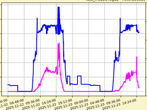 Much of the other stuff implemented now has become necessary for myself when I started experimenting with a “Balcony Power Station”, i.e. some solar panels to feed power into my regular home AC-power system. Here an example from miserable 2-days in November in Germany. (Blue is solar-voltage, magenta is solar-current).